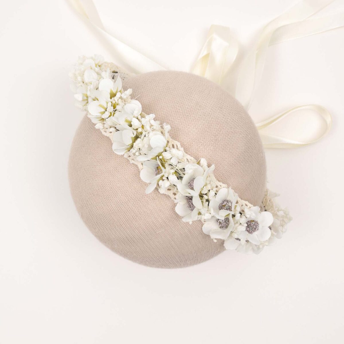 White floral crown featuring small fabric flowers and delicate dried floral accents on a lace base. Finished with a soft ribbon tie for an adjustable fit.