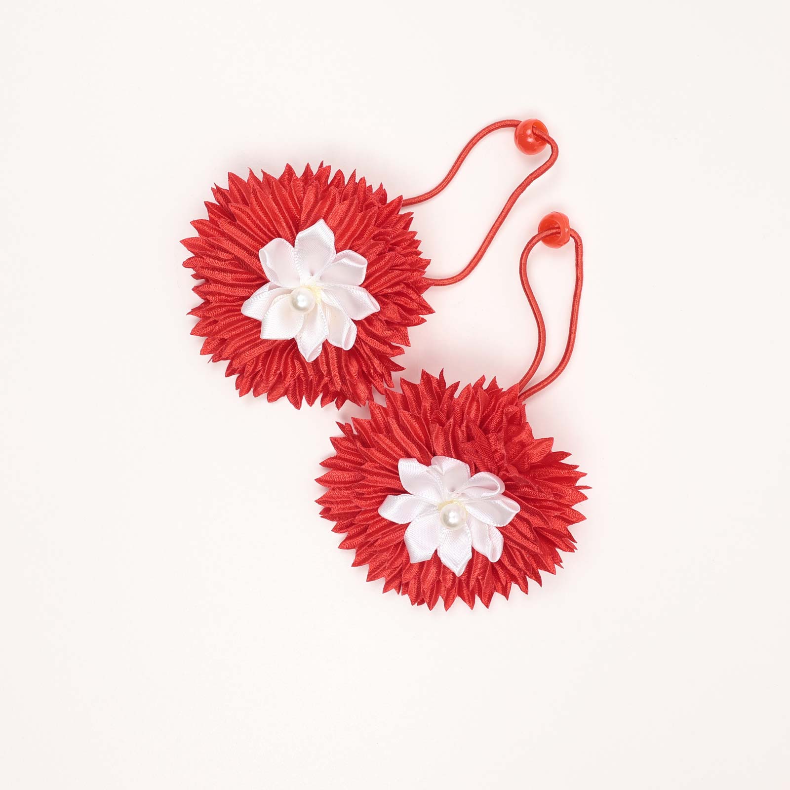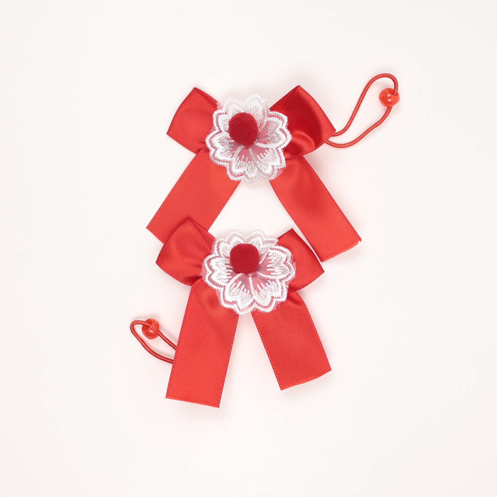 A pair of white lace hair ties adorned with red ribbon loops and a soft fabric ball center, attached to elastic bands.